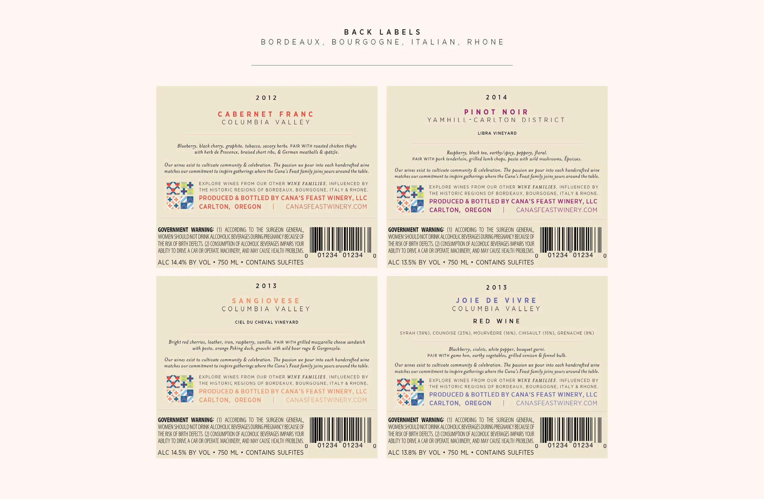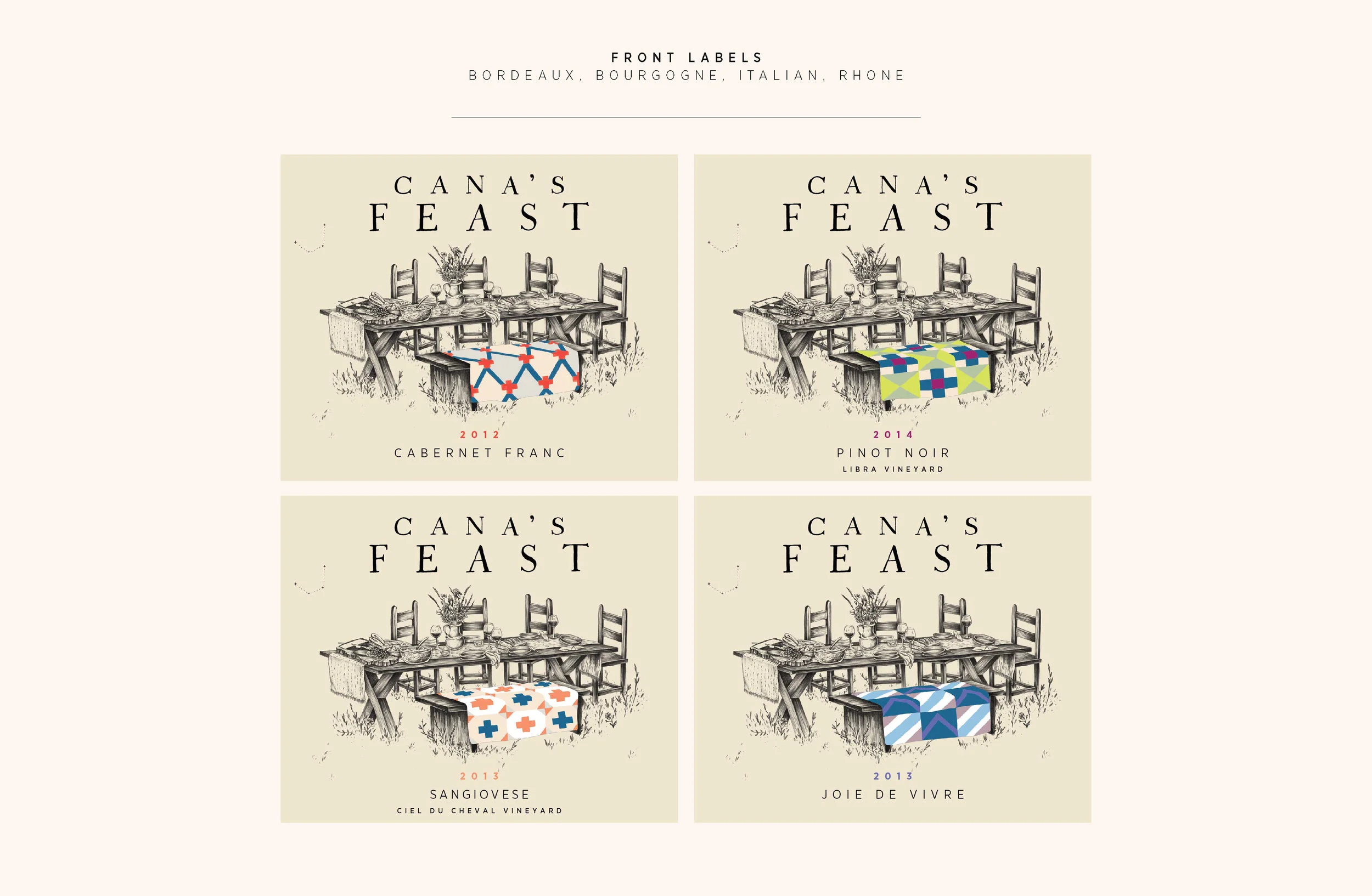 The Cana's Feast rebrand was a robust project including written content for their brand story and creation of brand guidelines, word mark, logo design, and typography, wine bottle labeling system; capsules, corks, front and back labels for 30+ varietals and blends. Research and development of the Family/Blanket system including color palette, pattern design, family crest, and commissioned artwork. Collateral for print and digital materials included brand business cards, wine rack cards, brochure, newsletter, cellar club sign up, media kit, product sheet and winery menu.