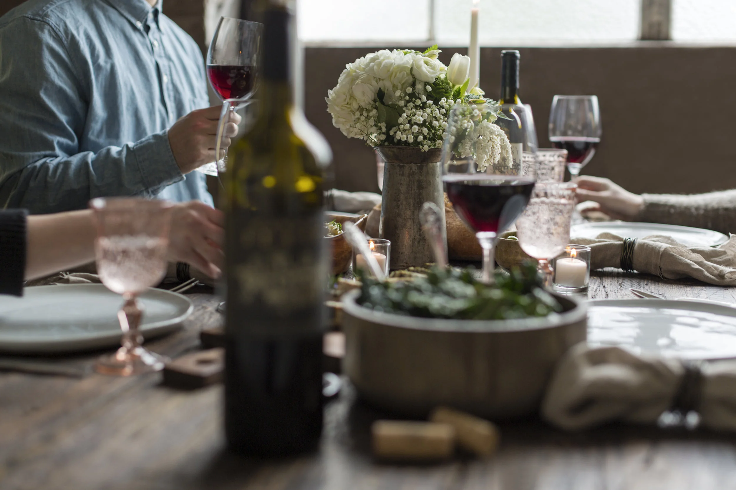 Tucked within our family tables are points of discovery beyond the obvious blanket. Our constellation, named for Table Mountain, home to the Twelve Apostles mountain range. A wine jug (like one you might find in a depiction of the Feast at Cana) houses a bundle of blooms selected from each region for which the families are named. Iris (Bordeaux), red poppies (Bourgogne), rhododendron (Italy), and lavender (Rhone).